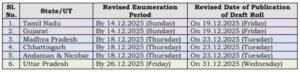 बता दें कि गुरुवार को 11 राज्यों और तीन केंद्र शासित प्रदेशों में एसआईआर के लिए फॉर्म जमा करने की आखिरी तारीख थी। केरल को पहले ही 18 दिसंबर तक छूट दी जा चुकी थी। केरल को छोड़कर सभी राज्यों और केंद्र शासित प्रदेशों की ड्राफ्ट मतदाता सूची 16 दिसंबर को प्रकाशित होने वाली थी, जबकि केरल की 23 दिसंबर को। आयोग ने सोशल मीडिया पर पोस्ट कर बताया कि छह राज्यों/केंद्र शासित प्रदेशों के मुख्य निर्वाचन अधिकारियों से मिले अनुरोधों के आधार पर कार्यक्रम में बदलाव किया गया है।