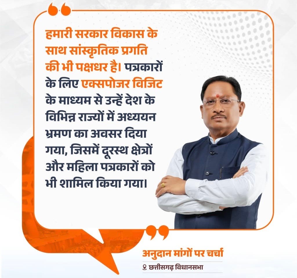 मुख्यमंत्री ने कहा कि राज्य सरकार विकास के साथ सांस्कृतिक प्रगति की भी पक्षधर है। पत्रकारों के लिए एक्सपोजर विजिट के माध्यम से उन्हें देश के विभिन्न राज्यों में अध्ययन भ्रमण का अवसर दिया गया, जिसमें दूरस्थ क्षेत्रों और महिला पत्रकारों को भी शामिल किया गया। उन्होंने कहा कि रायपुर साहित्य उत्सव का आयोजन राज्य की सांस्कृतिक चेतना को नई ऊर्जा देता है और इस बार भी इसके लिए बजट प्रावधान किया गया है। साथ ही प्रवासी छत्तीसगढ़िया सम्मेलन आयोजित करने का निर्णय भी लिया गया है, जिससे प्रदेश के बाहर अपनी पहचान बनाने वाले छत्तीसगढ़िया लोगों के अनुभवों से नई पीढ़ी को प्रेरणा मिलेगी।