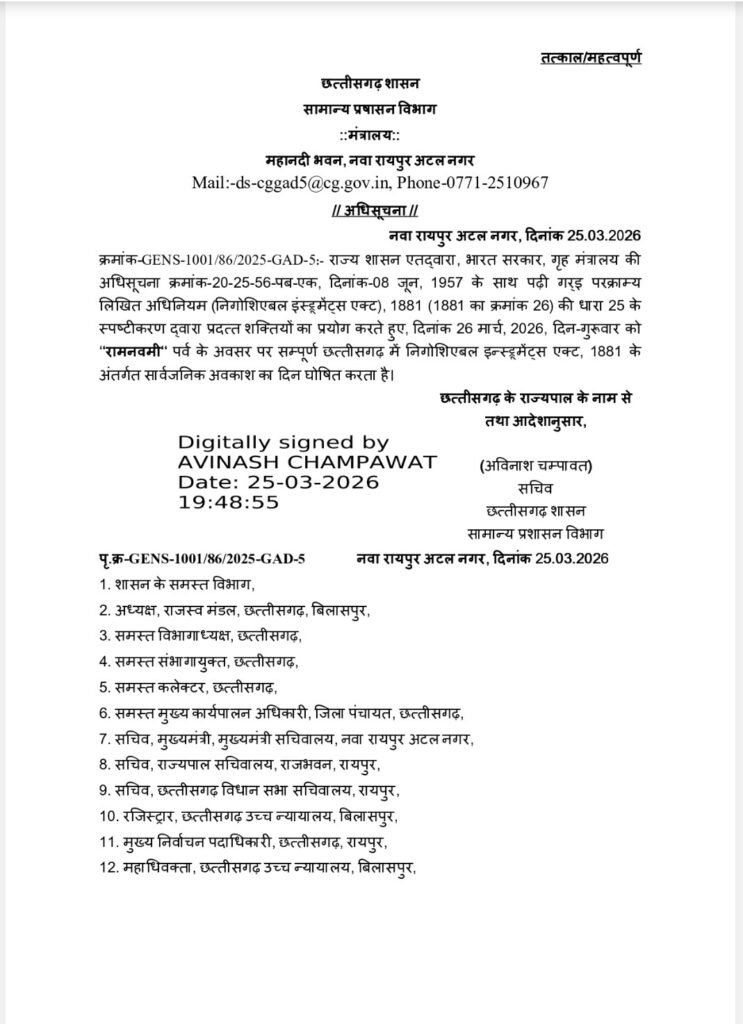 छत्तीसगढ़ में रामनवमी पर कल 26 मार्च को छुट्टी घोषित… सरकारी और शिक्षण संस्थान बंद रहेंगे