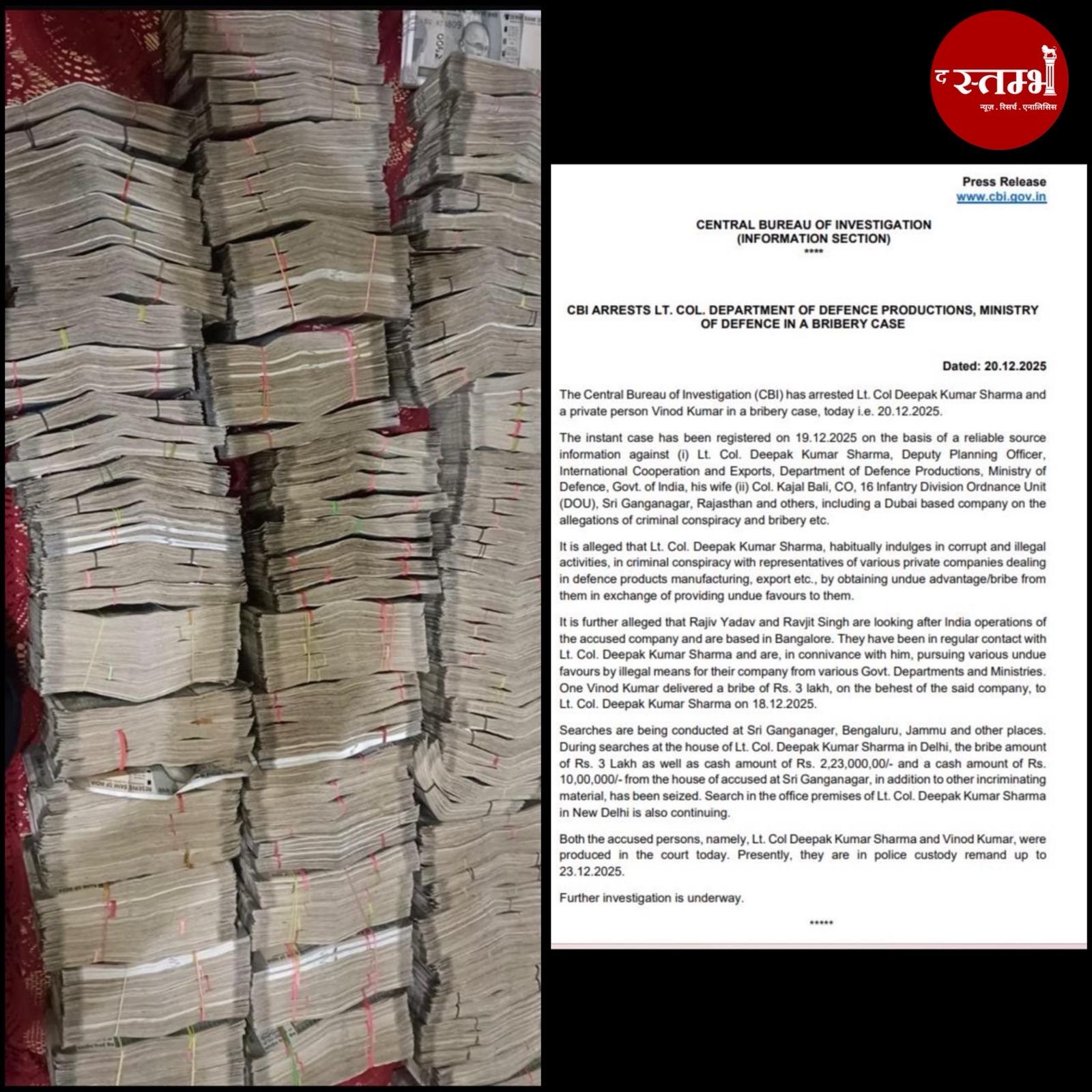 केंद्रीय जांच ब्यूरो (सीबीआई) ने आज शनिवार को 3 लाख रुपए की रिश्वत के मामले में लेफ्टिनेंट कर्नल दीपक कुमार शर्मा और विनोद कुमार नाम के एक व्यक्ति को गिरफ्तार कर लिया। इसके बाद लेफ्टिनेंट कर्नल के घर पर सीबीआई ने छापा मारा तो नोटों का अंबार लगा था। सीबीआई की ओर से अधिकृत जानकारी के अनुसार श्रीगंगानगर, बेंगलुरु, जम्मू और अन्य स्थानों पर तलाशी ली गई। श्रीगंगानगर में लेफ्टिनेंट कर्नल शर्मा के घर पर तलाशी के दौरान रिश्वत के 3 लाख रुपये के साथ-साथ 2,23,000,00 रुपये नक़द राशि और 10,00,000 रुपये और जब्त किए गए हैं। नई दिल्ली में कर्नल दीपक कुमार शर्मा के कार्यालय में भी जाँच जारी है।
