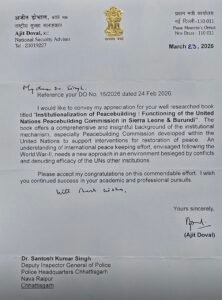 राष्ट्रीय सुरक्षा सलाहकार अजीत डोभाल ने छत्तीसगढ़ कैडर के आईपीएस तथा डीआईजी संतोष कुमार सिंह की किताब Institutionalization of Peacebuilding – Functioning of the United Nations Peacebuilding Commission in Sierra Leone and Burundi के लिए किए गए रिसर्च की सराहना की है। इसके लिए उन्होंने बाकायदा आईपीएस संतोष सिंह को चिट्ठी लिखी है। एनएसए डोभाल की ओर से इस तरह की प्रतिक्रियाएं कम आती हैं, इसलिए इस पत्र को महत्वपूर्ण माना जा रहा है। यही नहीं, प्रधानमंत्री कार्यालय में प्रधान सचिव शक्ति कांत दास ने भी इस पुस्तक के लिए आईपीएस संतोष सिंह के समर्पण और प्रयास की सराहना की है।